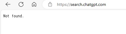 현재는 이 챗GPT 검색 사이트에 접속하면 "Not found" 라는 문자열이 출력되고 있습니다. 하지만 역설적으로 이런 메시지를 보여준다는 것은 준비하고 있는 것을 의미하는 것 입니다. 실제 없는 사이트 주소를 입력하면, 웹 브라우저 오류 메시지가 표시됩니다.